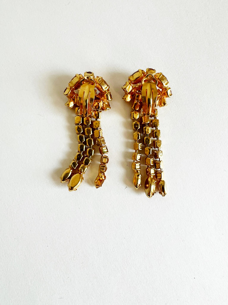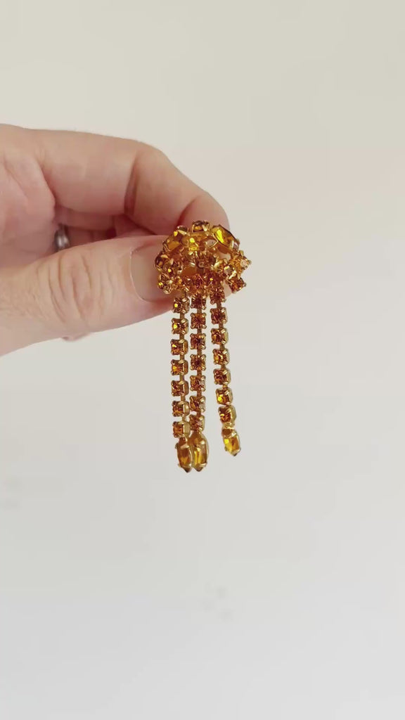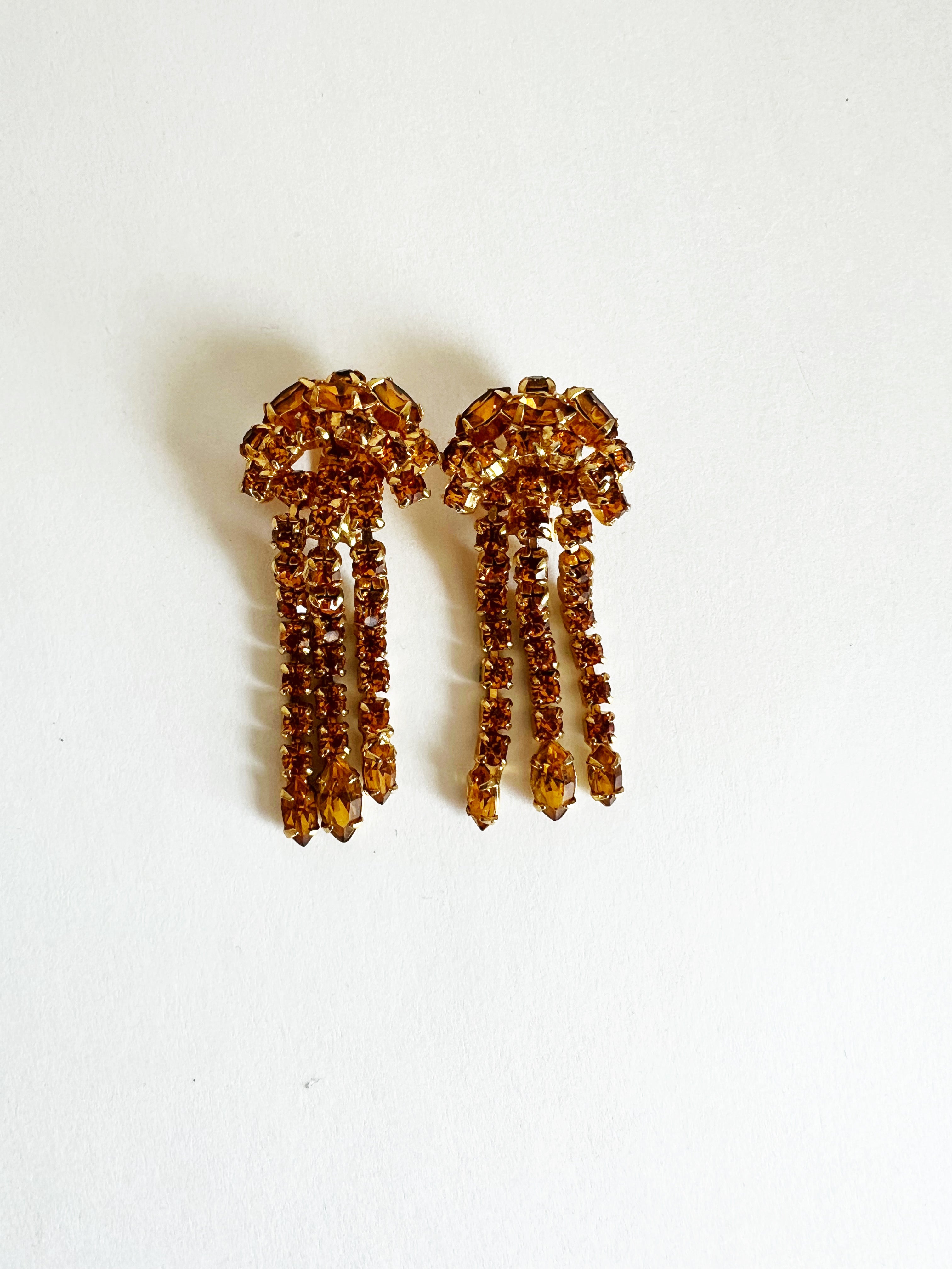 - Each earring features three strands of amber-colored prong-set rhinestones dangling from a crescent-shaped cluster of matching rhinestones