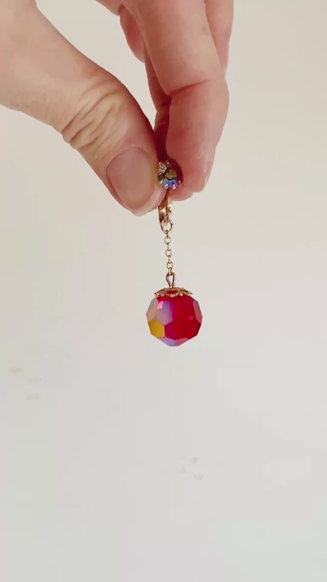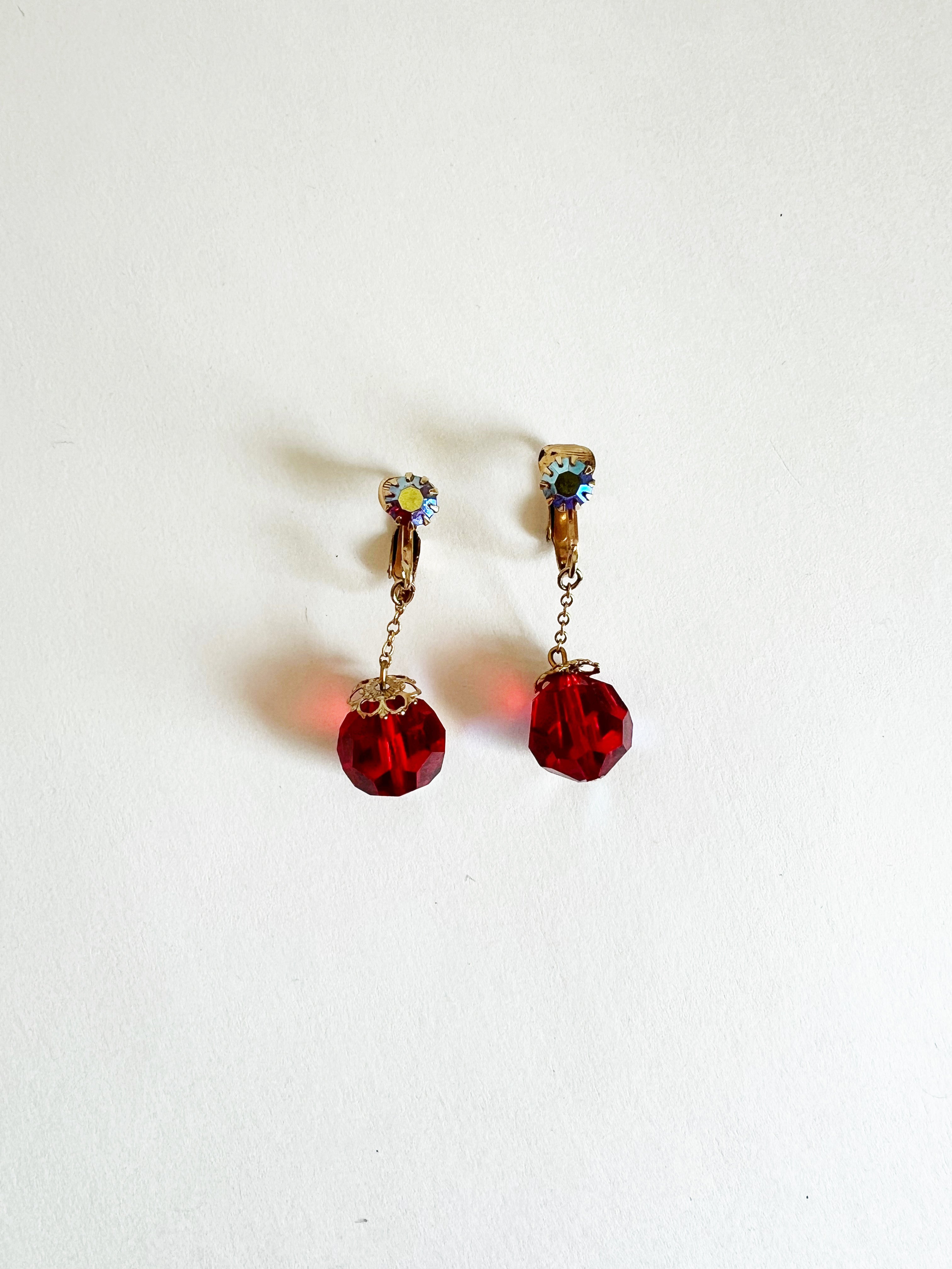 - Each earring features a single large red aurora borealis faceted glass bead dangling from a delicate gold chain, attached to a gold clip-on earring with a matching prong-set aurora borealis rhinestone