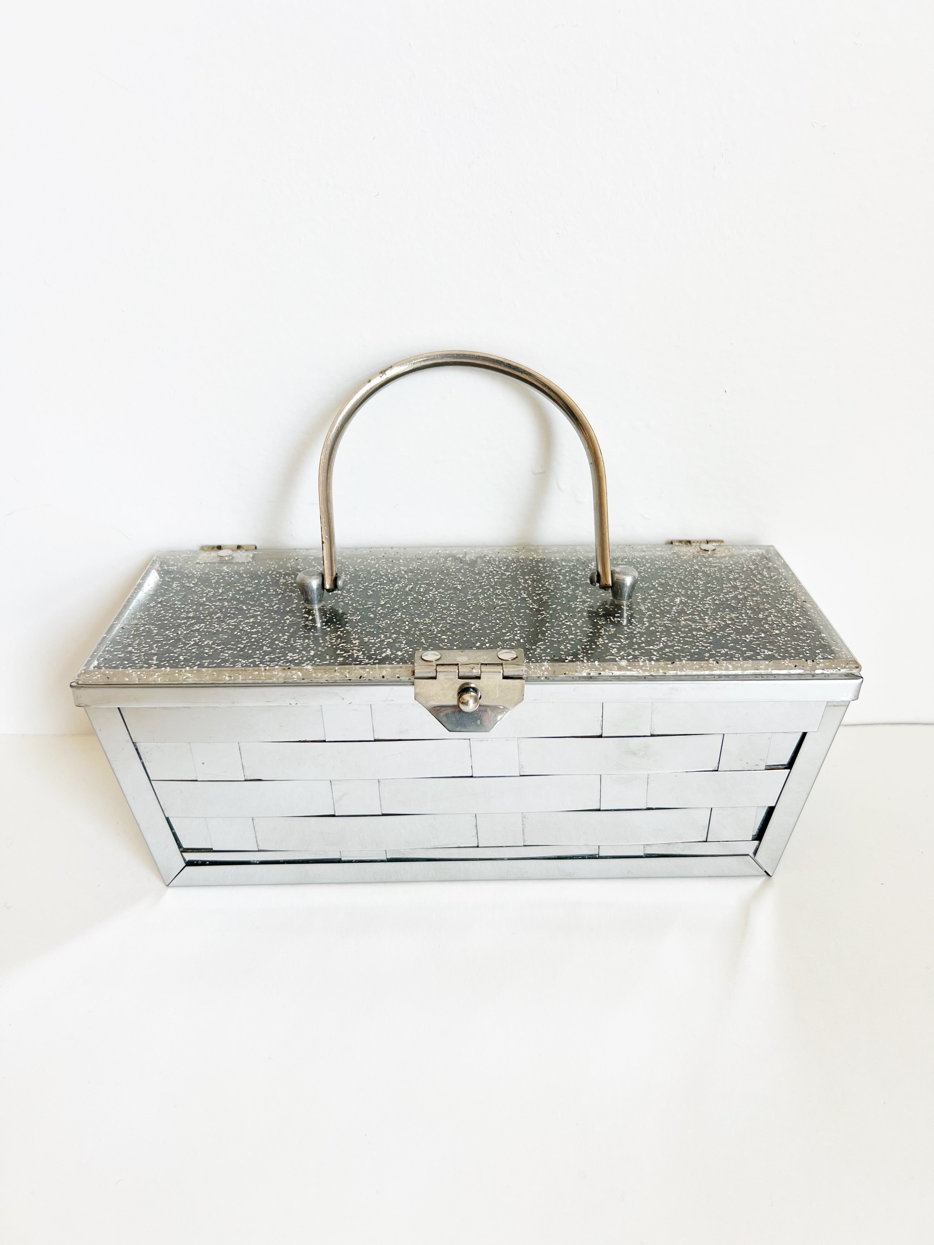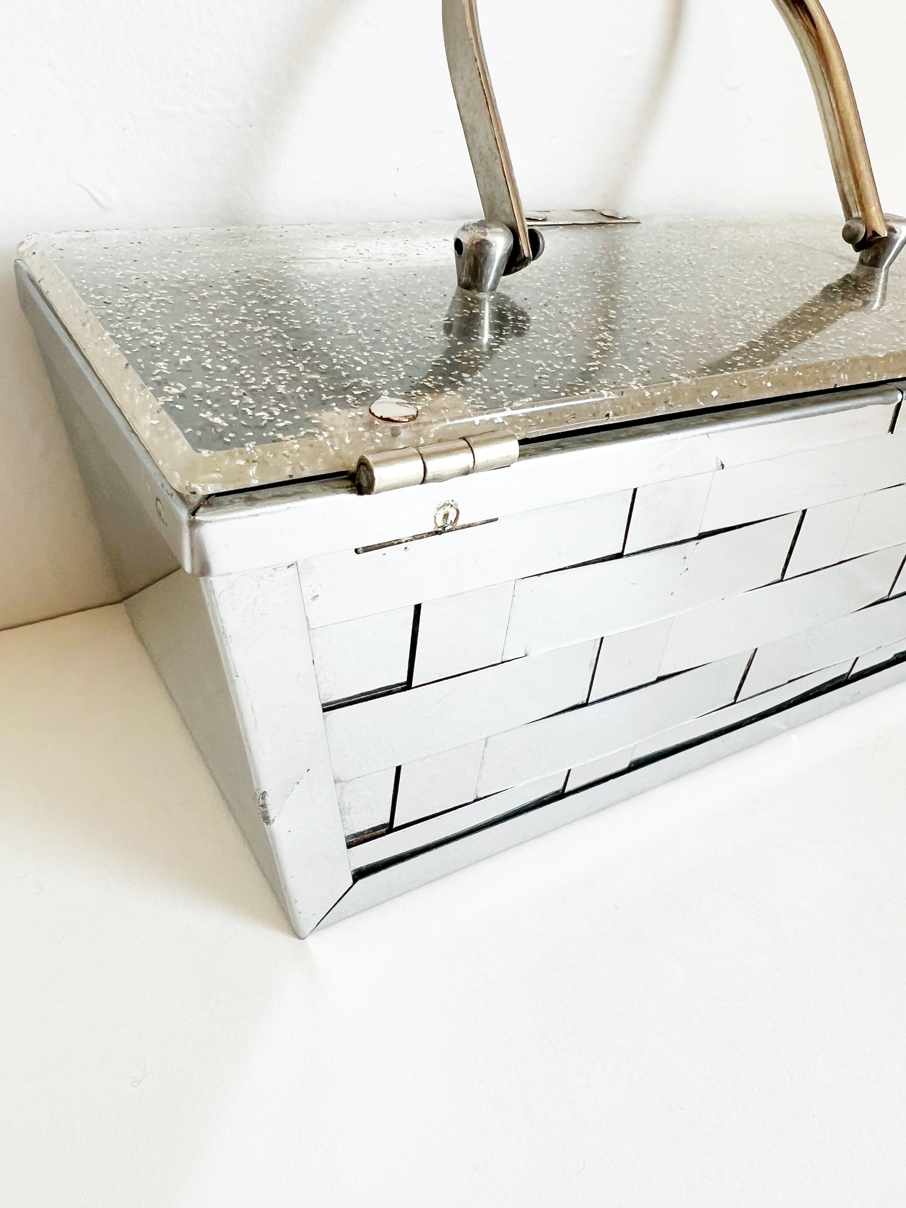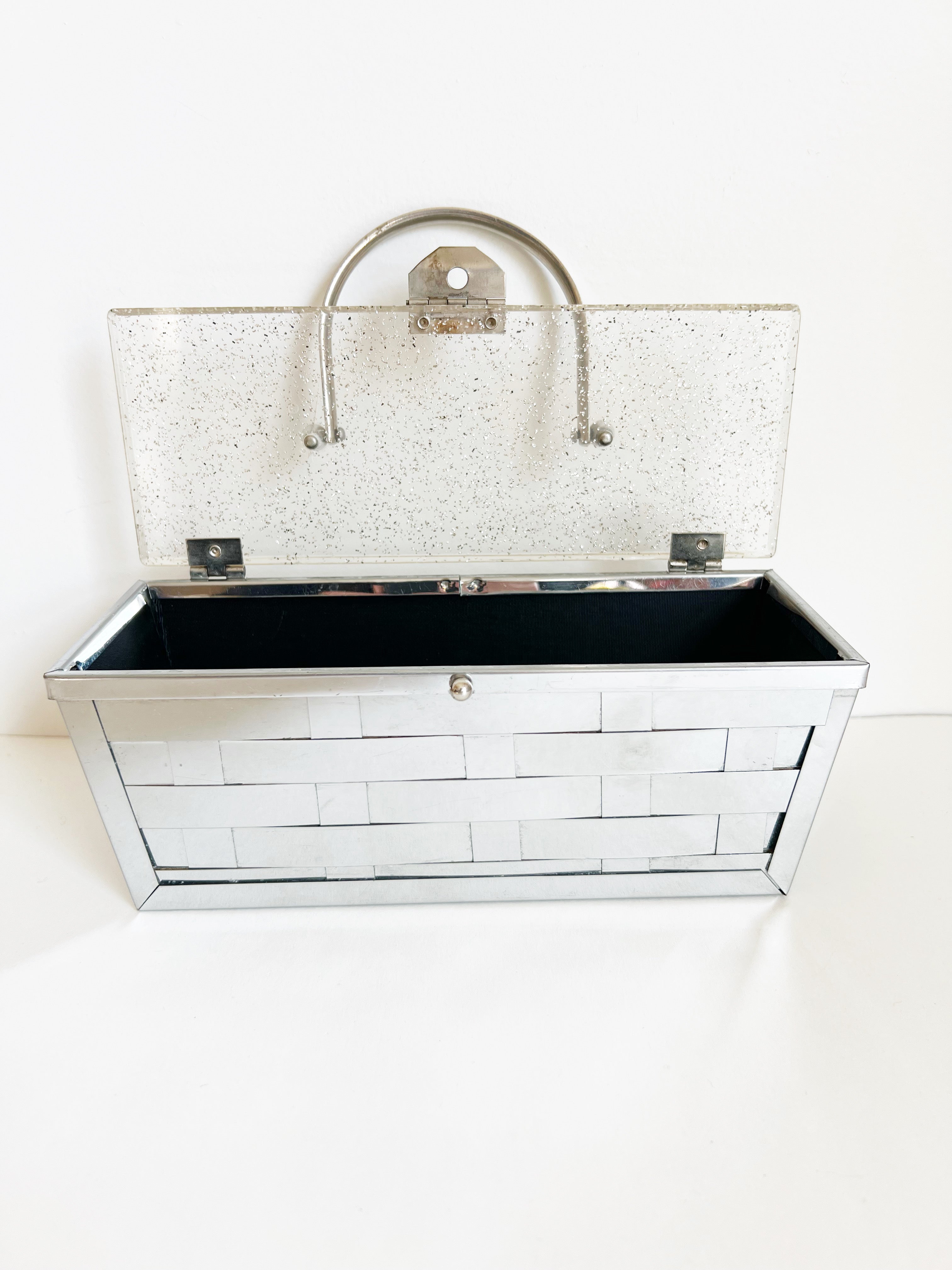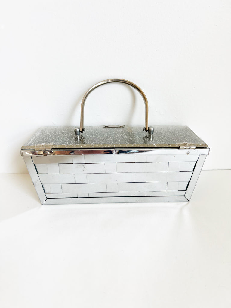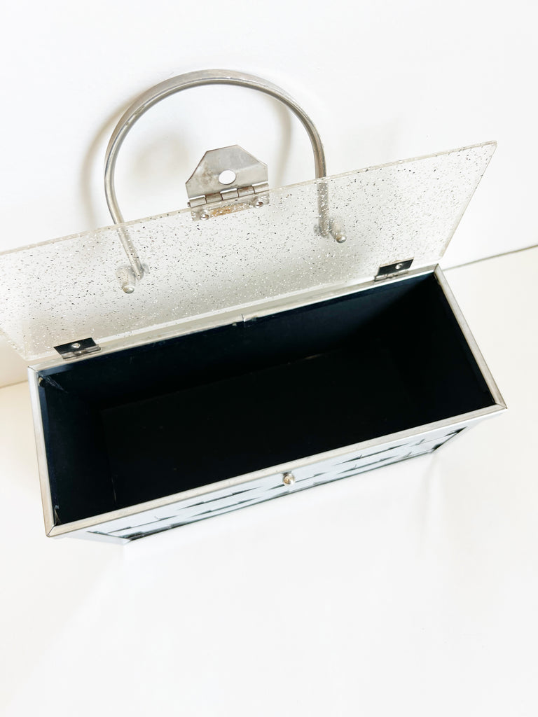 1950s Silver Confetti Lucite and Woven Metal Box Purse