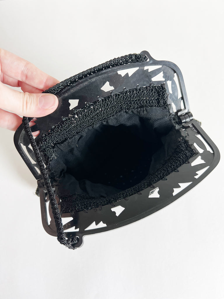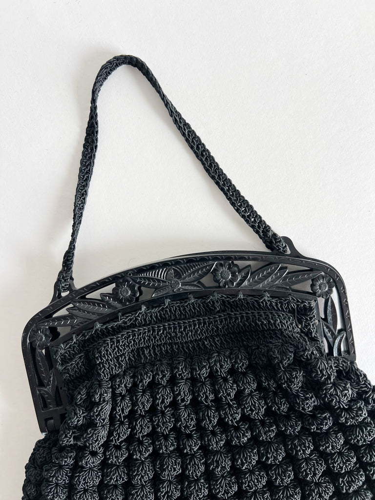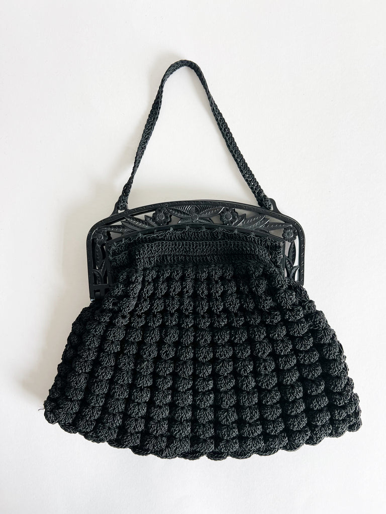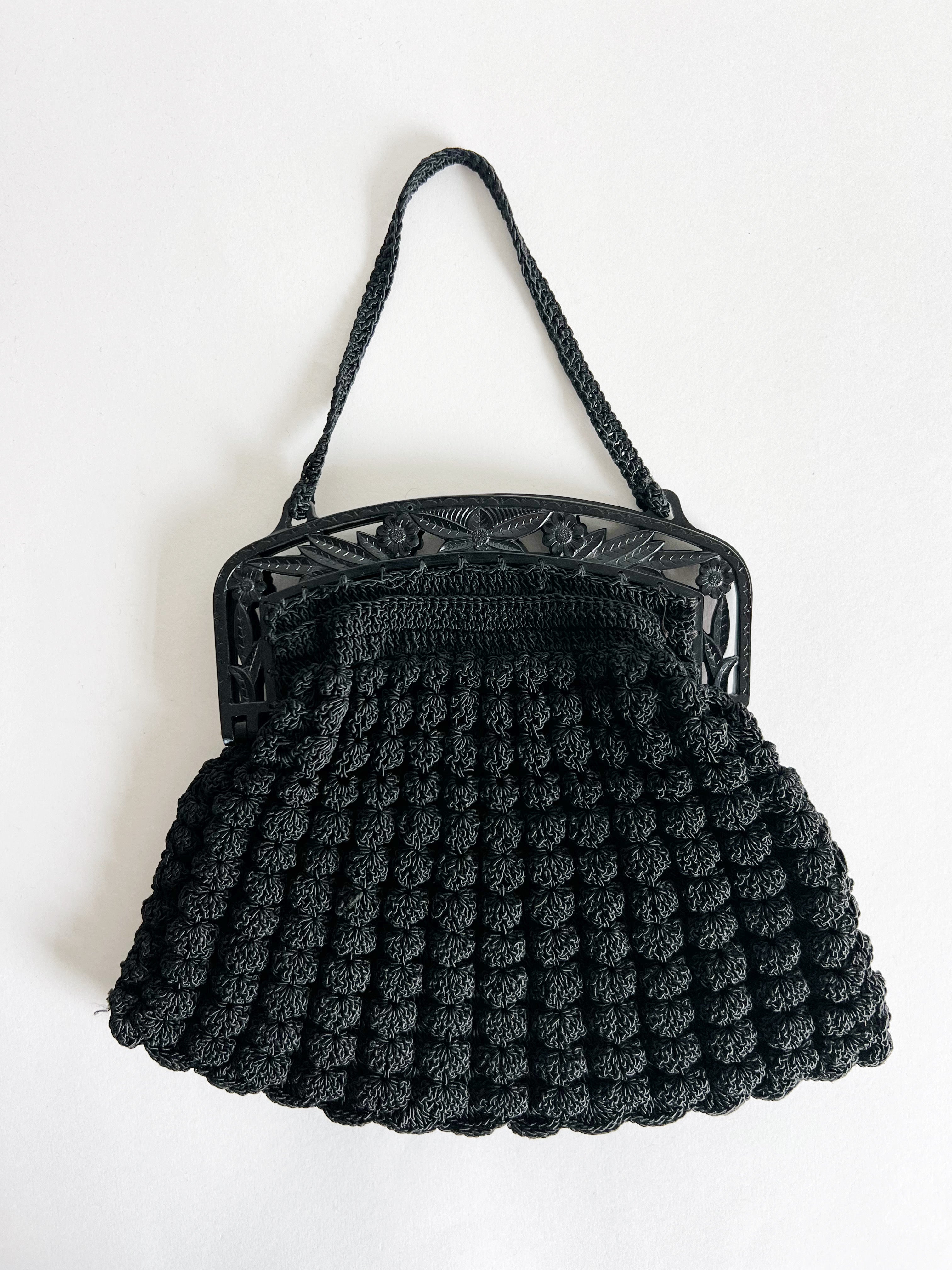 - Black cord crochet sewn to a plastic frame carved with a floral design