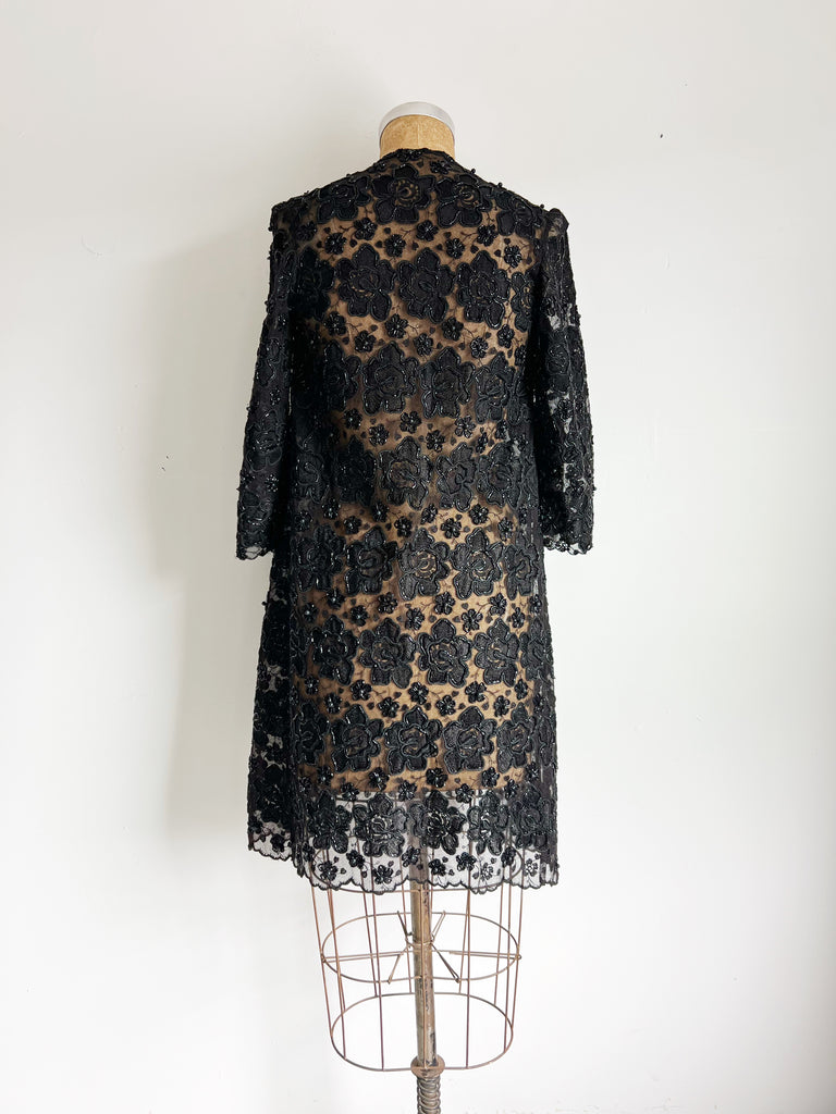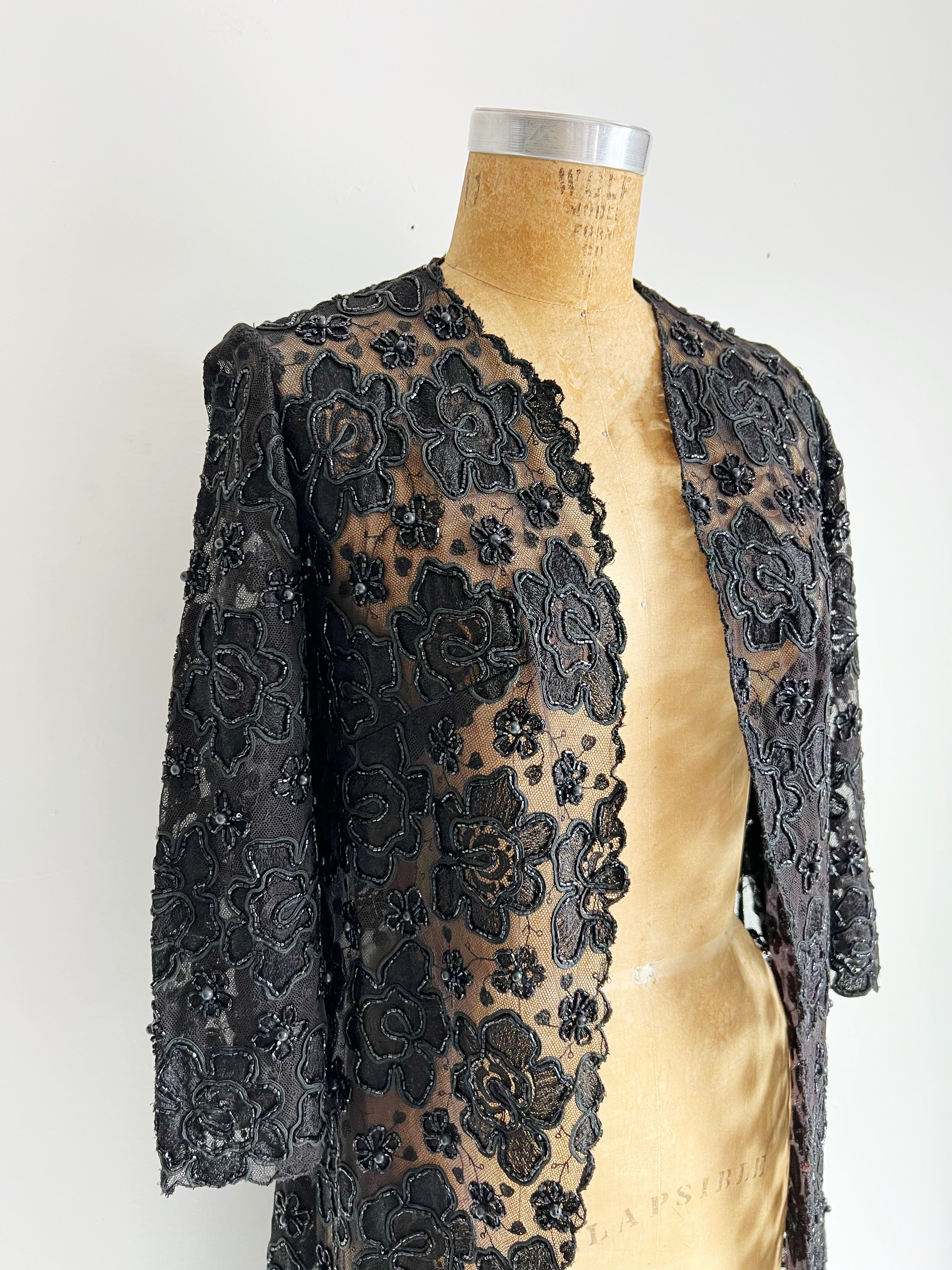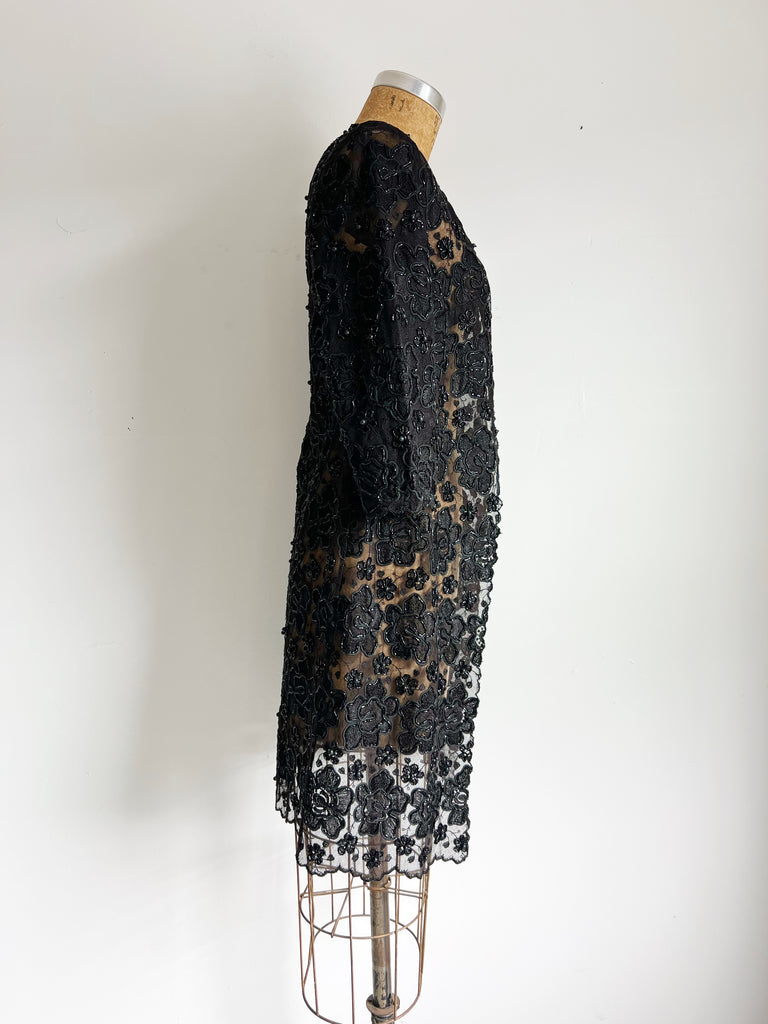 - Sheer black lace in a floral design, heavily beaded with sparkling black bugle beads