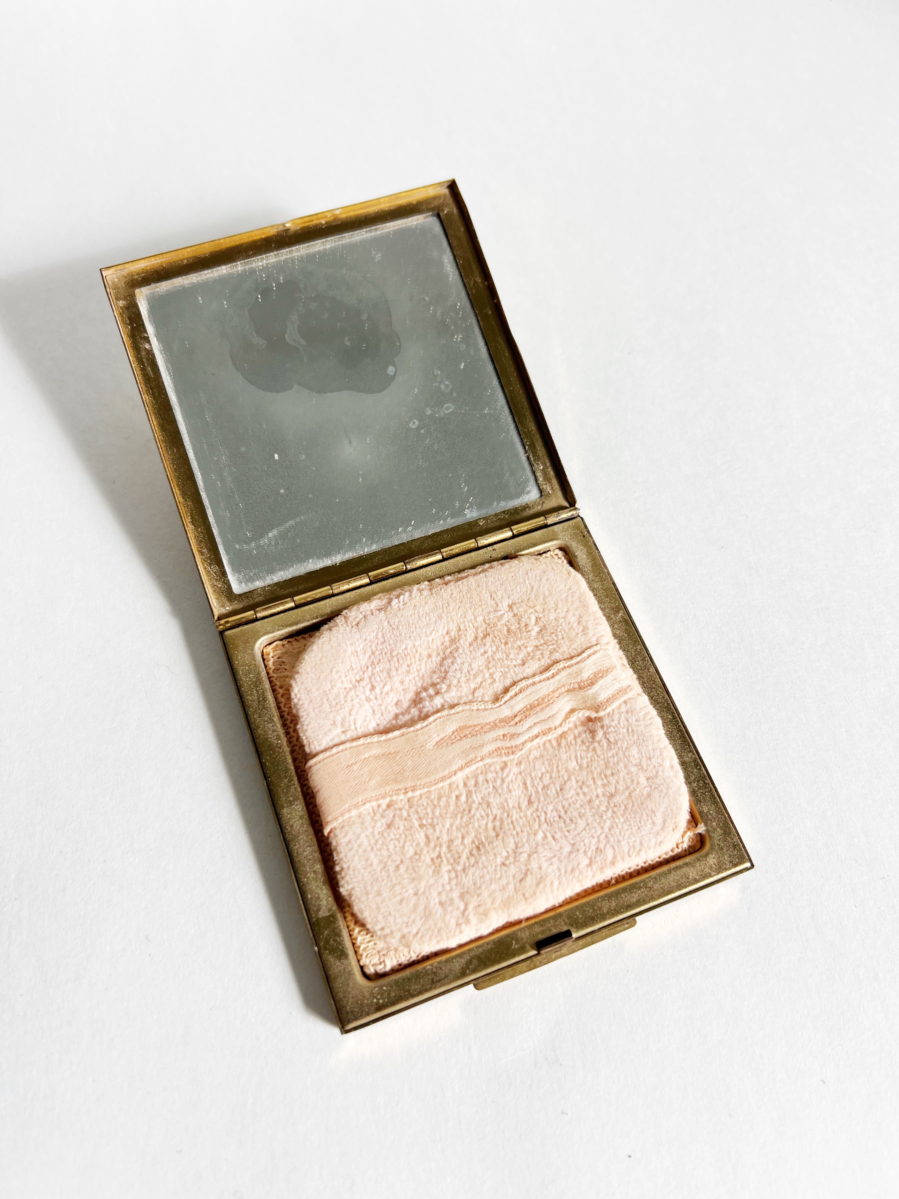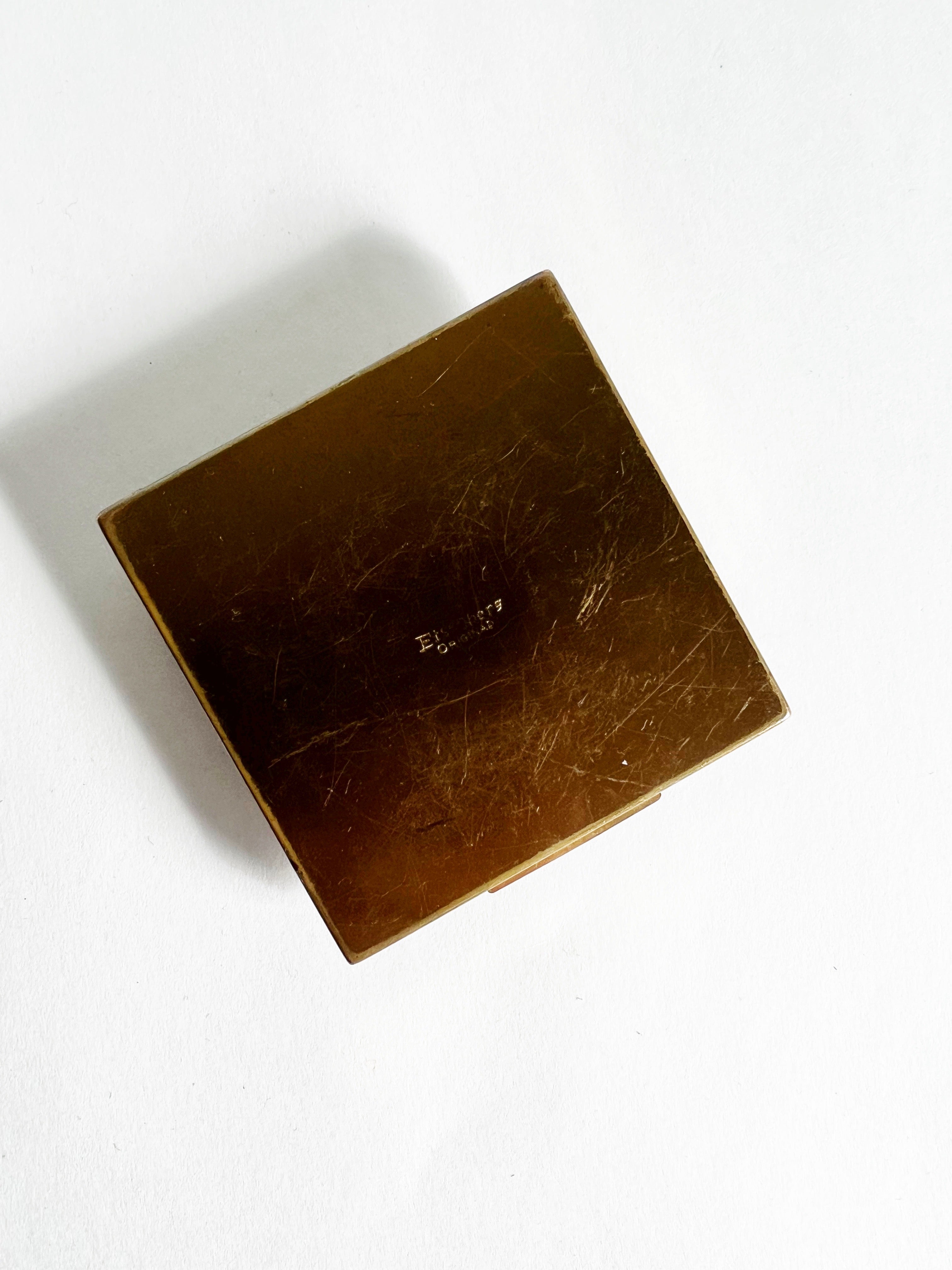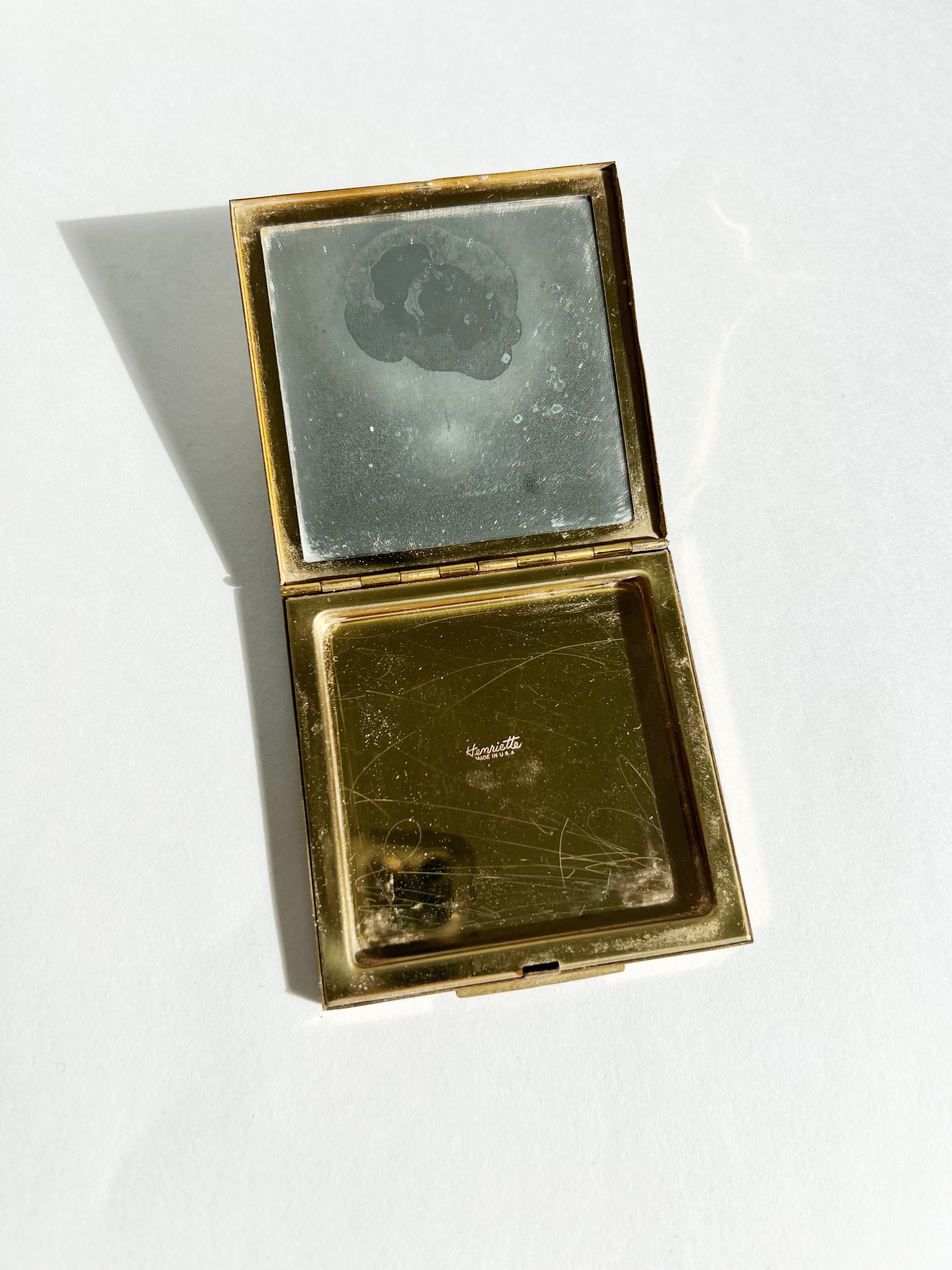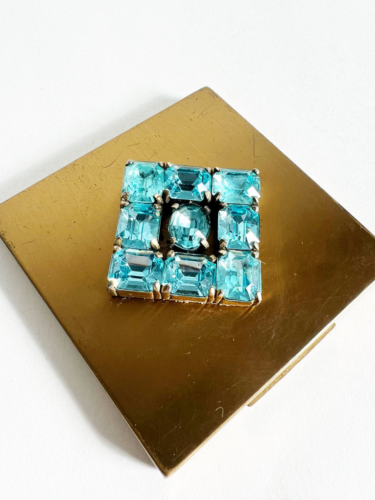 - Gold-tone metal square compact with large mixed-cut aquamarine rhinestones on top