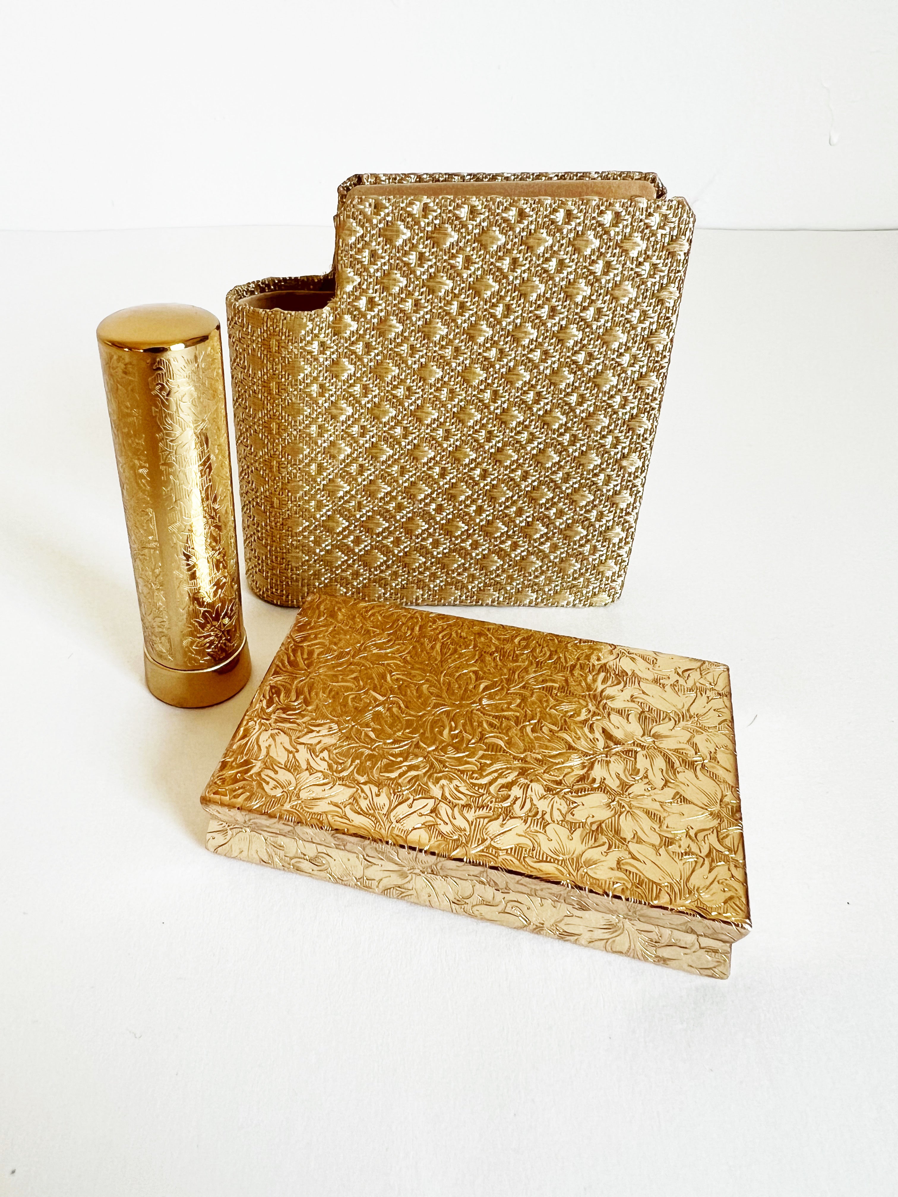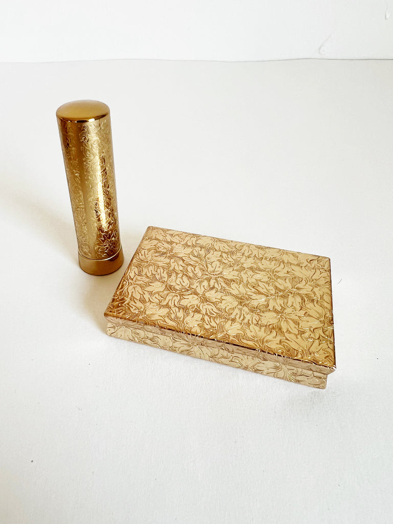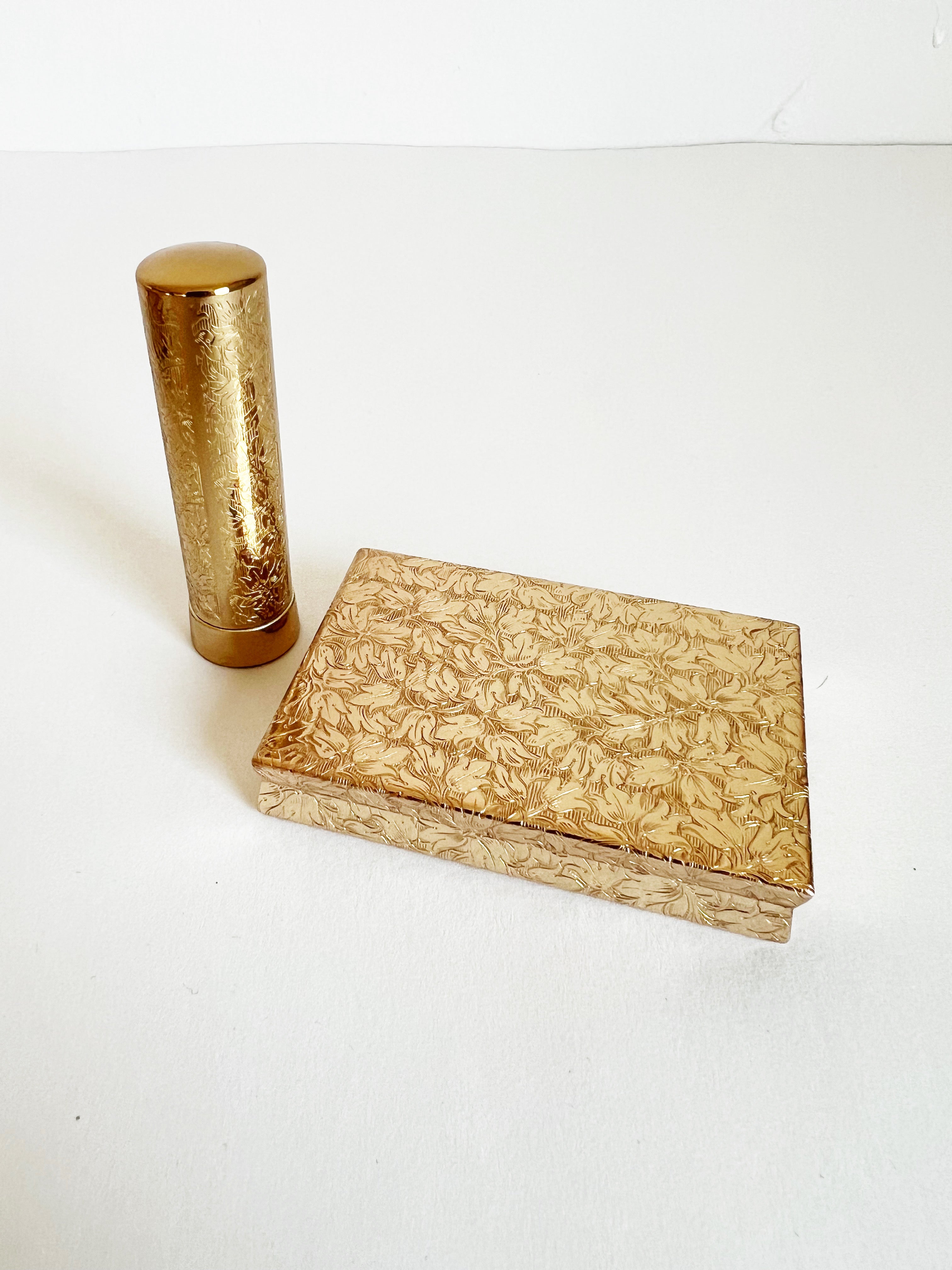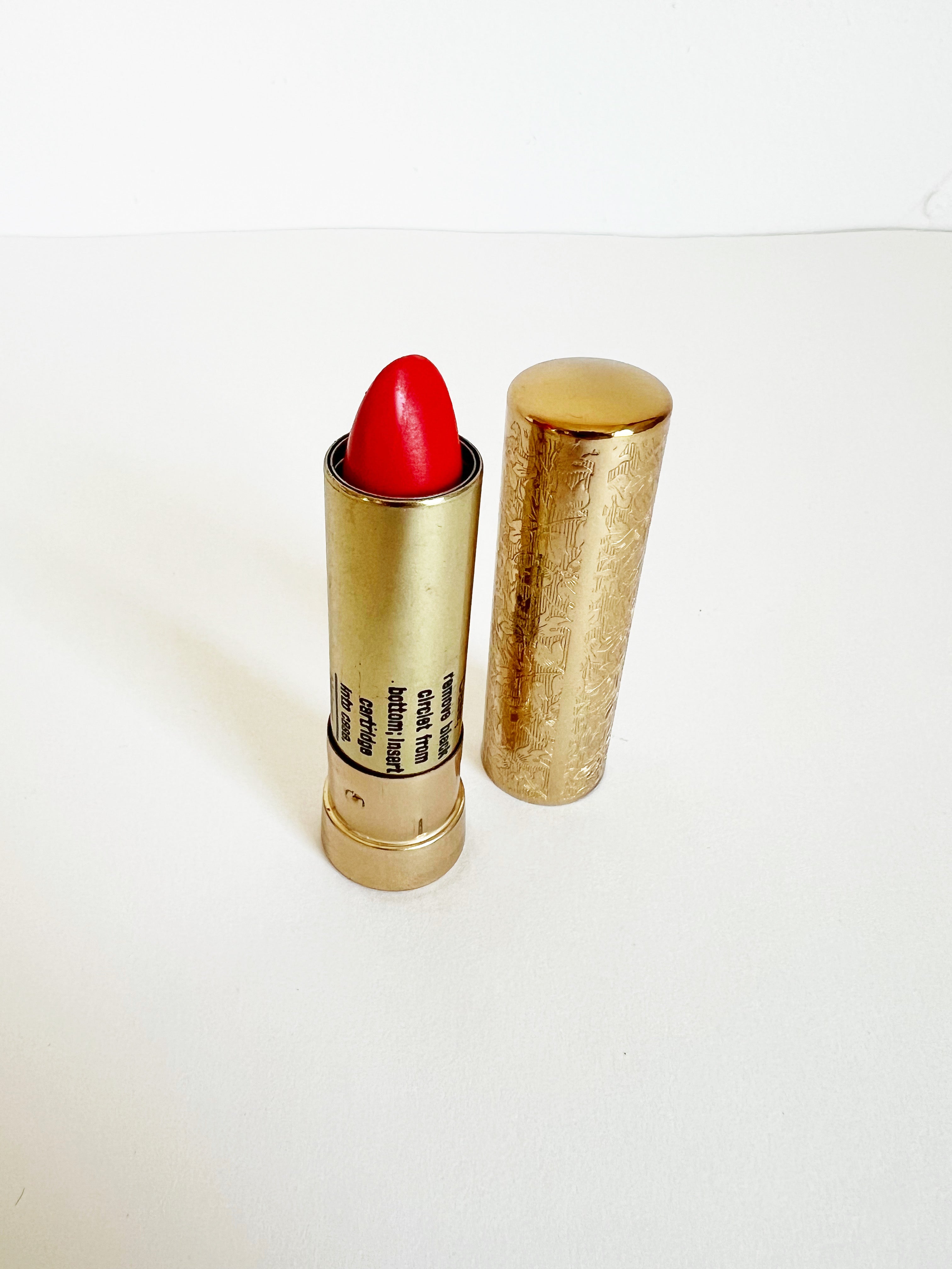 - Matching etched gold-tone lipstick in "sweet pepper" red shade