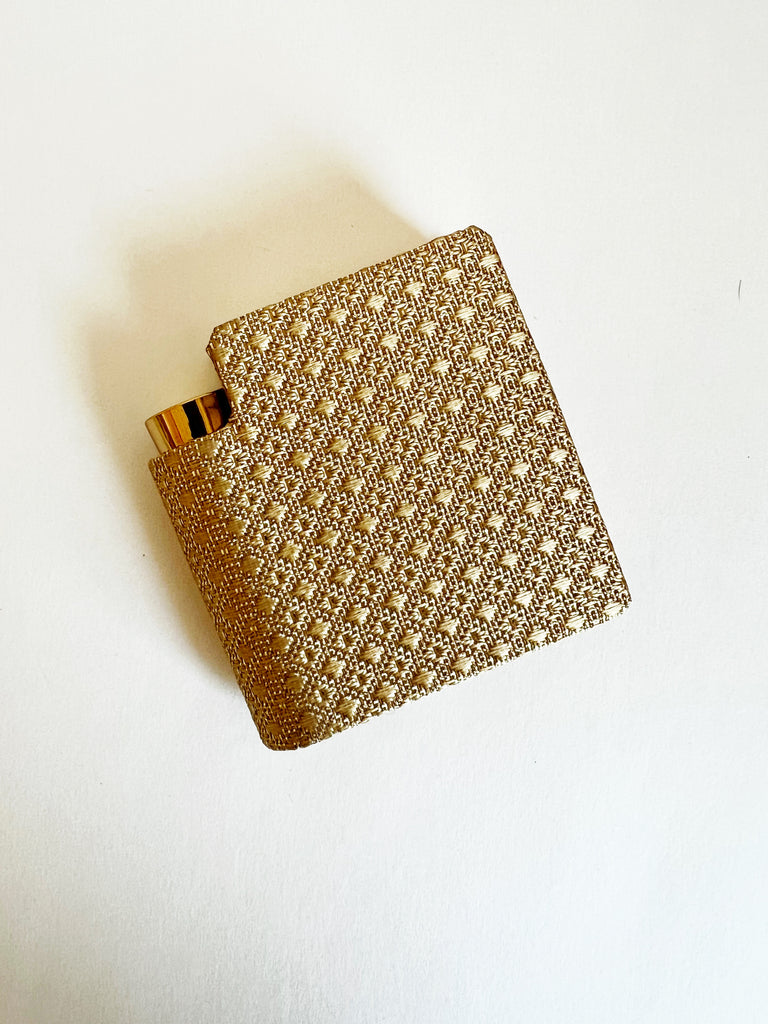 - Gold-tone metal powder compact etched on the exterior with a tulip design