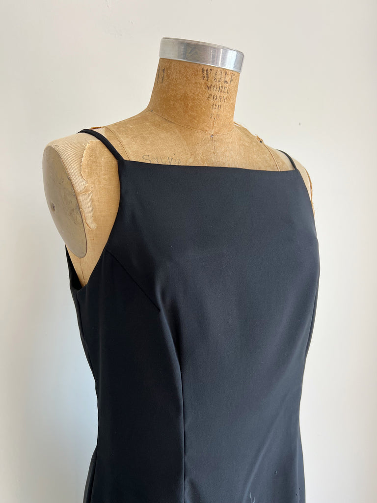 - Slightly stretchy black polyester-spandex blend sleeveless sheath dress