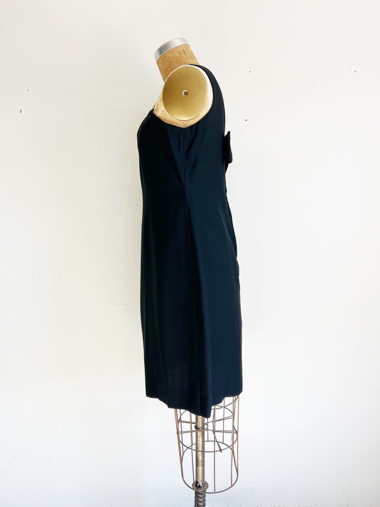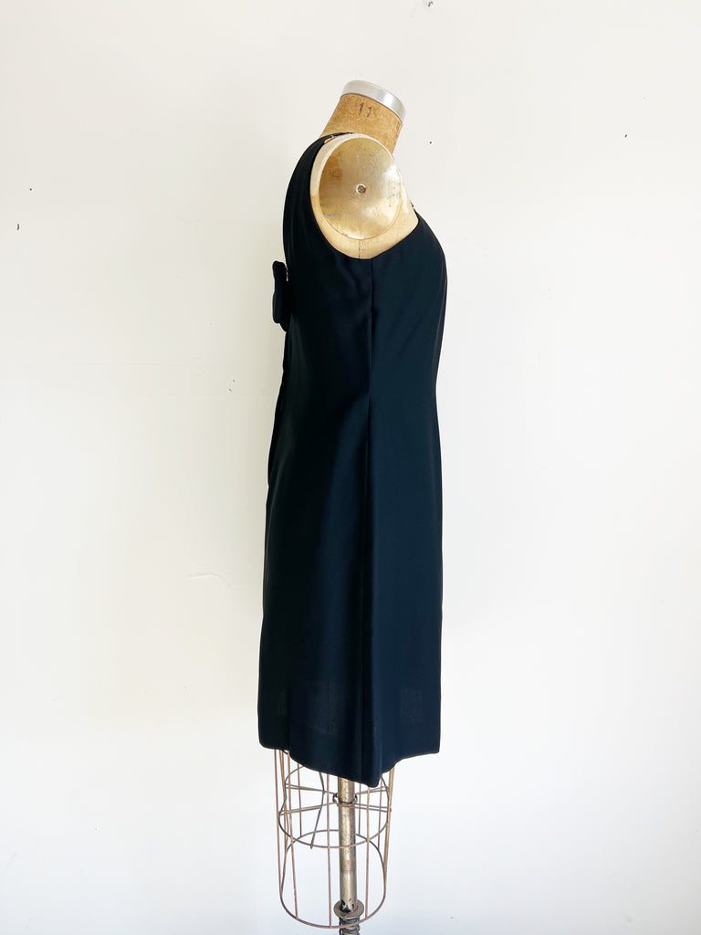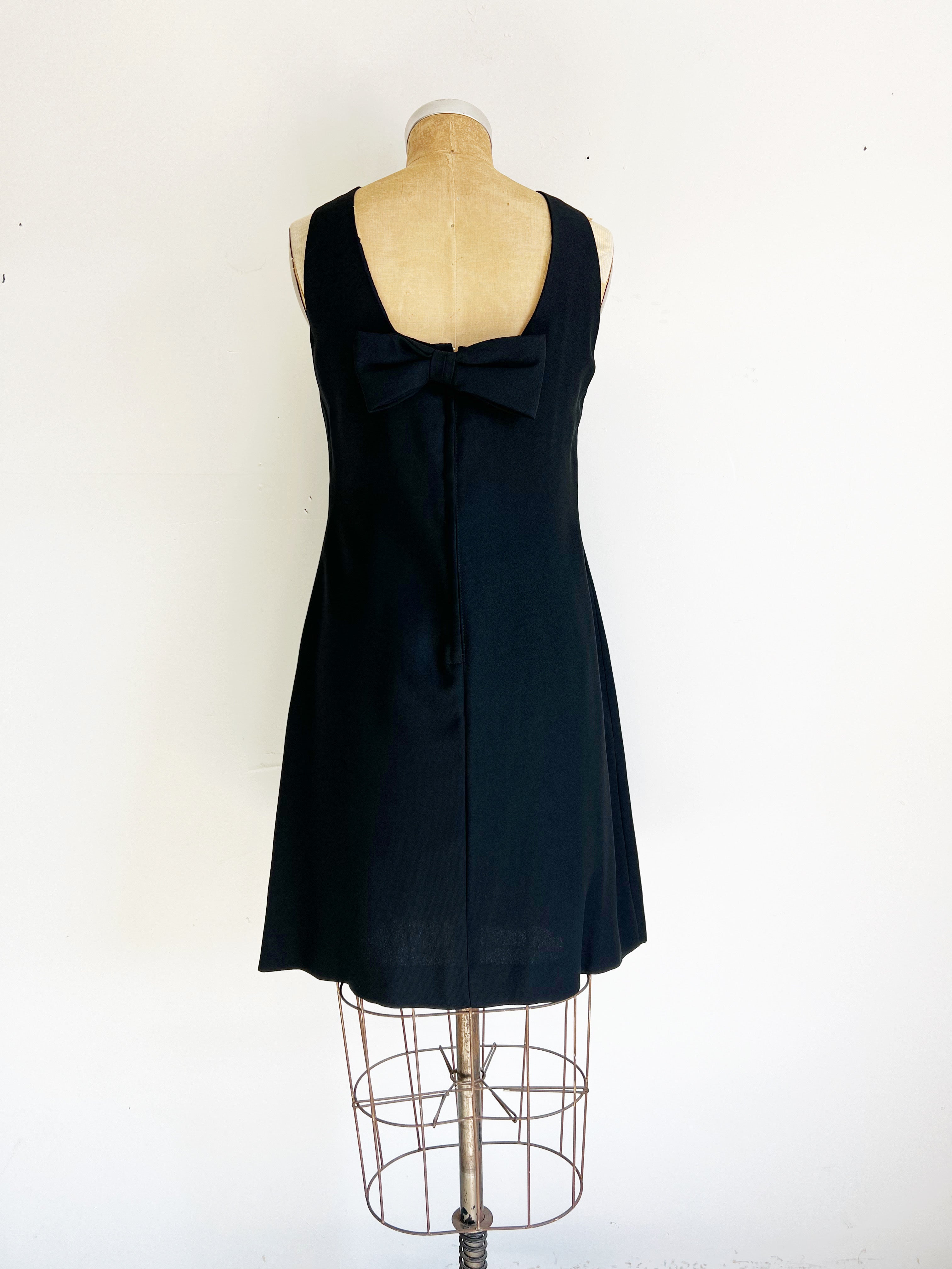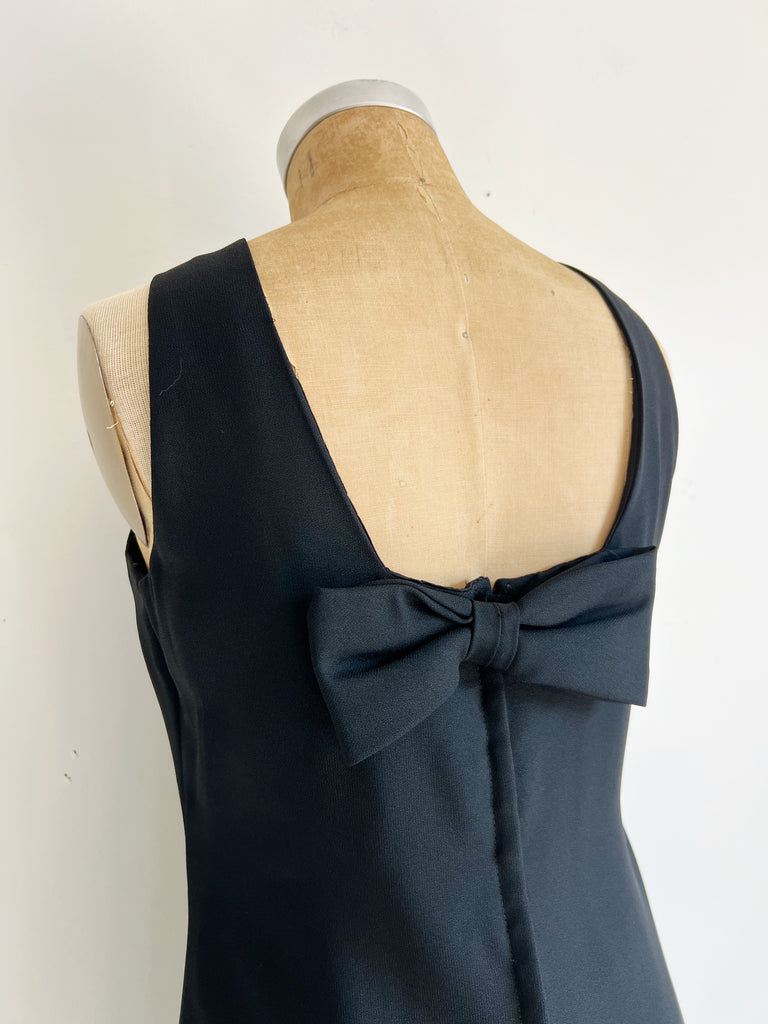 - Metal zipper on back with hook and eye; bow snaps over the zipper