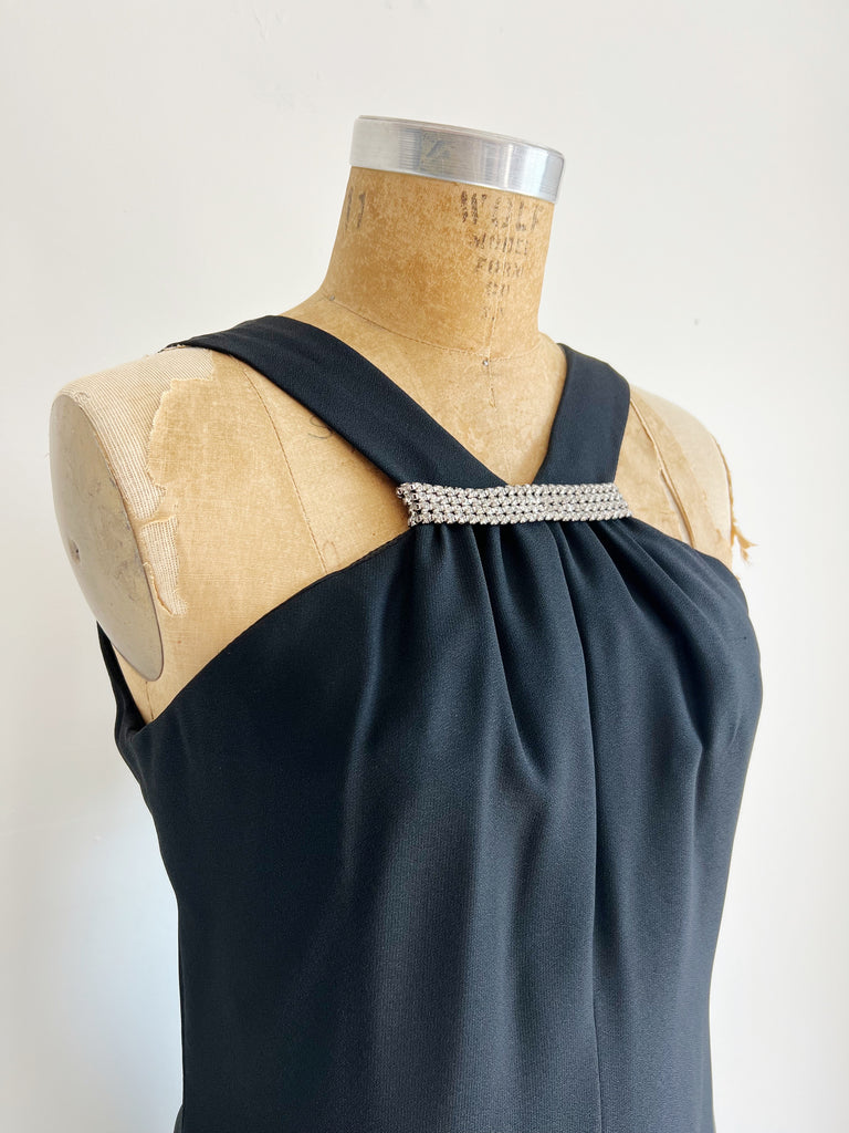 - Wide V-neck straps gathered by a band of sparkling rhinestones