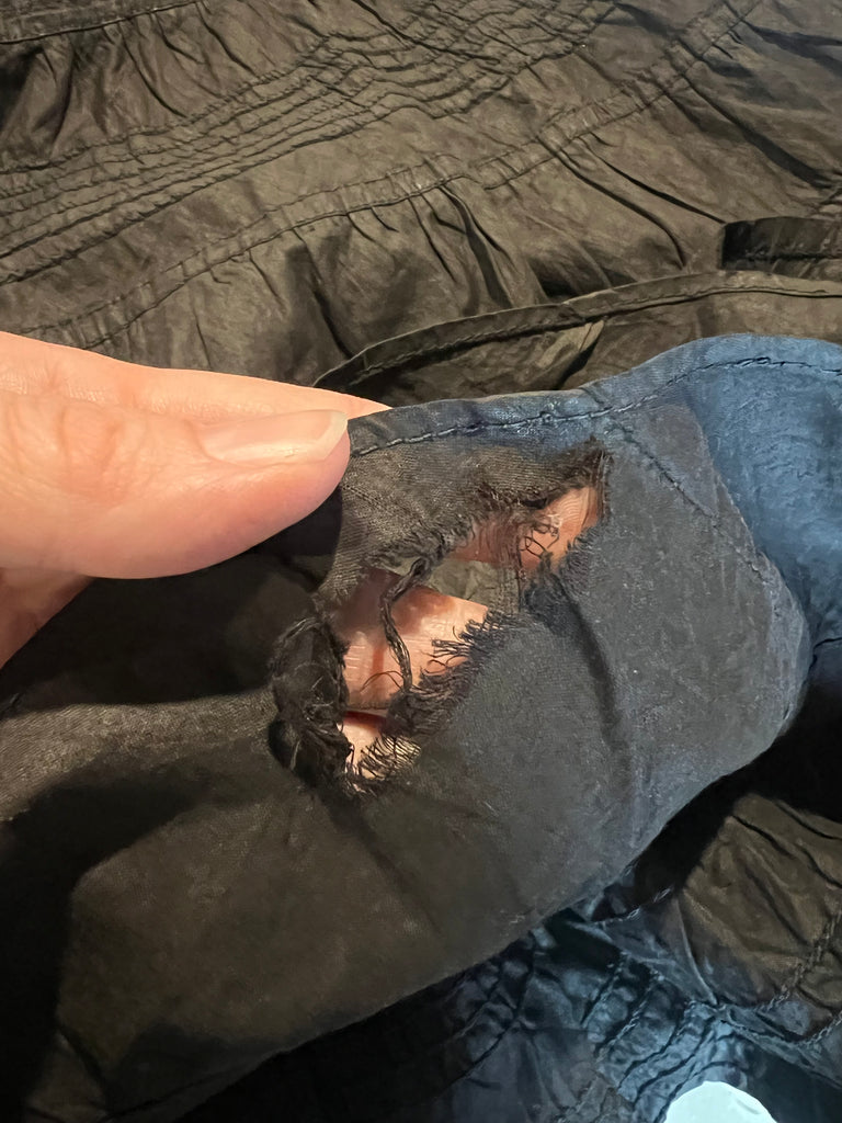 - Three snaps at the front of the waist with black cotton jersey gussets at the hips