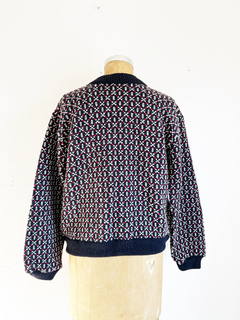• Navy, red, and white chunky wool-rayon blend knit in a traditional Norwegian birdseye pattern